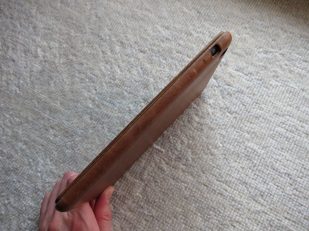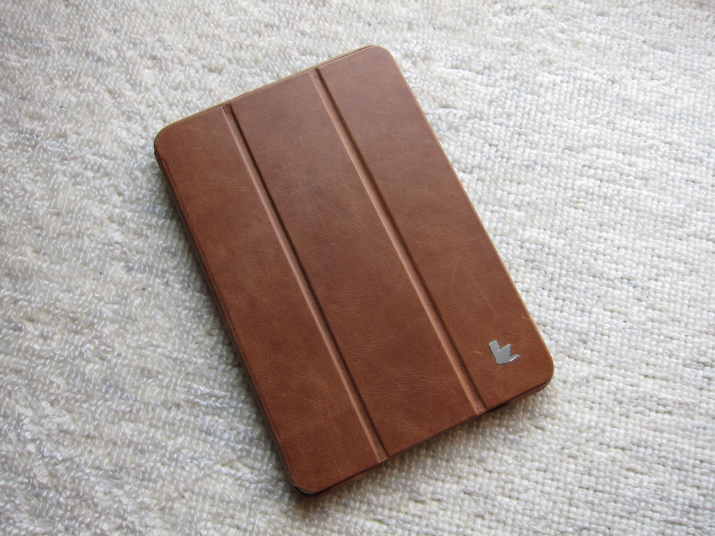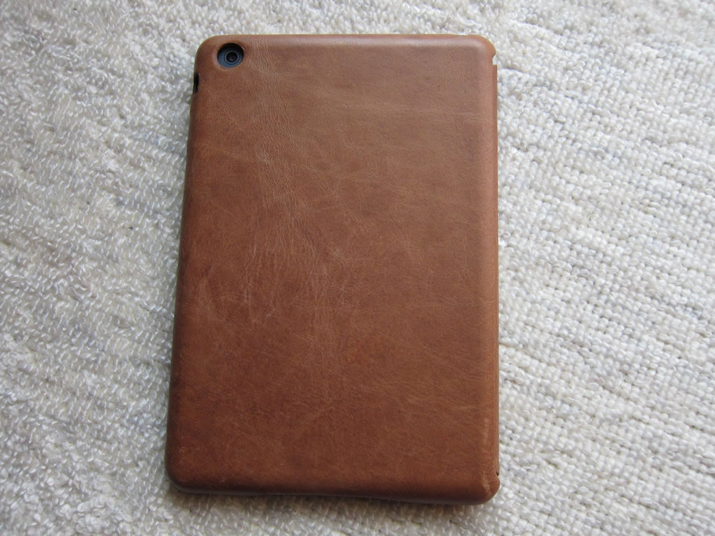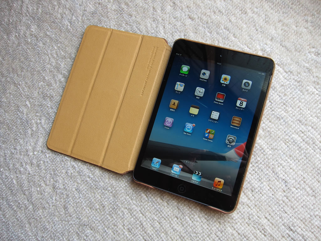 iPadは初代モデルよりパワーサポート社から販売されているレザーケースに入れて使っていて,これはこれで気に入っているものの,iPad mini用のサイズはまだラインナップになかったため,今回は気分を変えてブックカバーライクなケースを探してみました。そこで見つけたのが,JISONCASEの「ビンテージ レザー スマートケース for iPad mini」(ブラウン)。本体の薄さを損なわないコンパクトな仕上がりで,純正カバー同様スタンドにもなるスグレモノ。そして何より,風合いとシックなデザインが◎です。