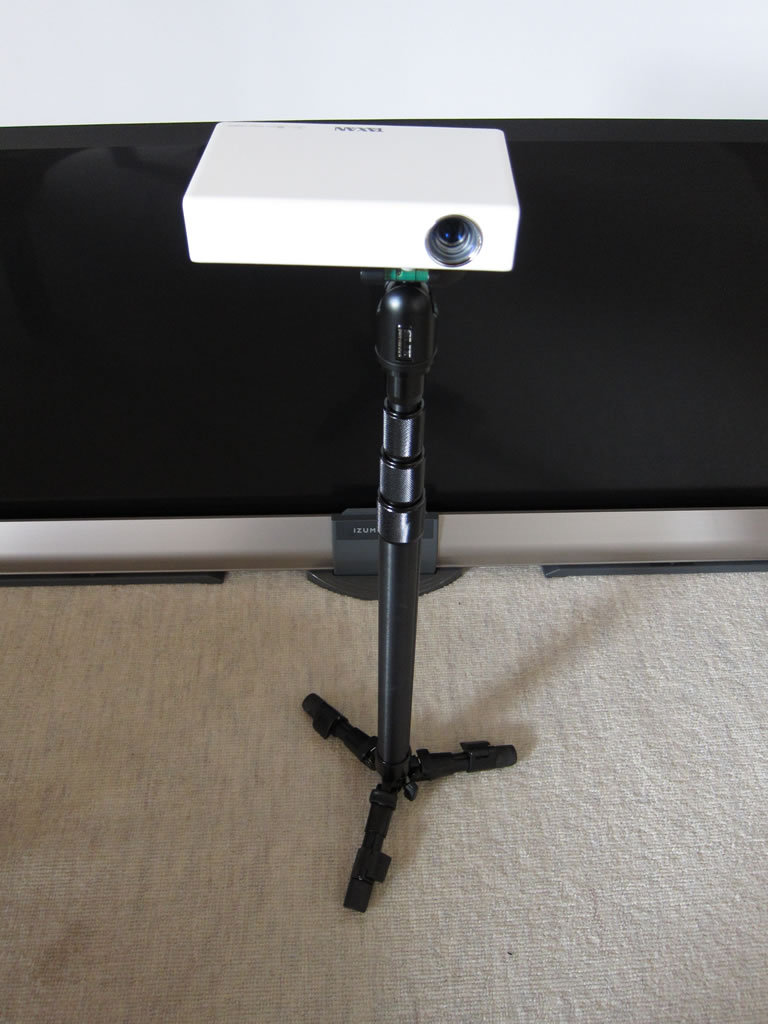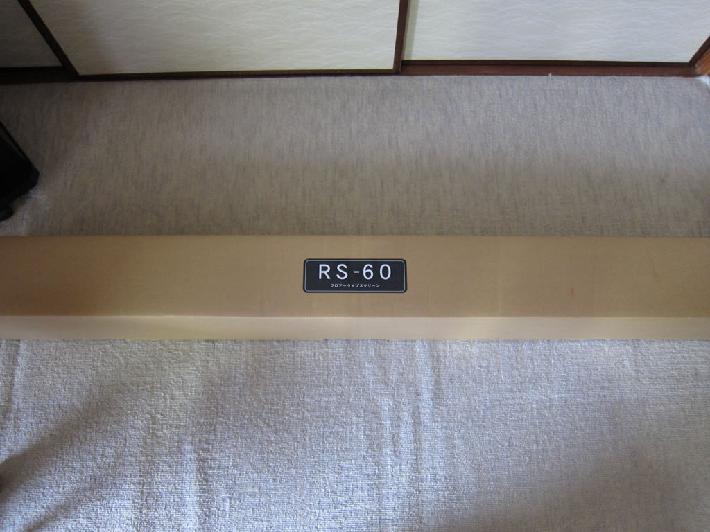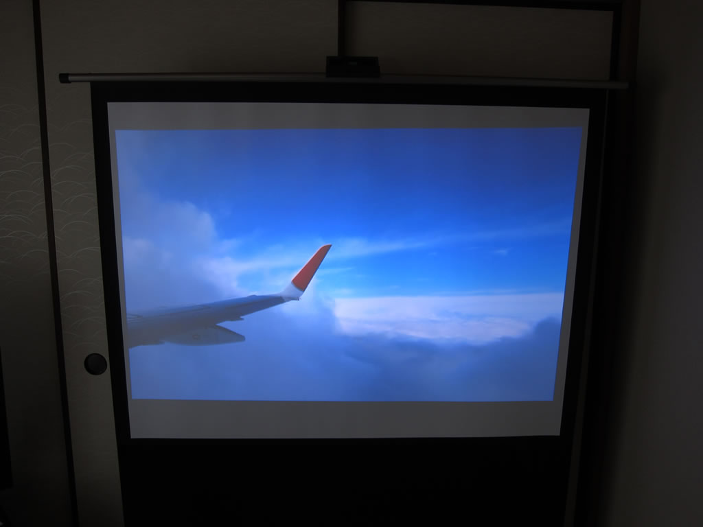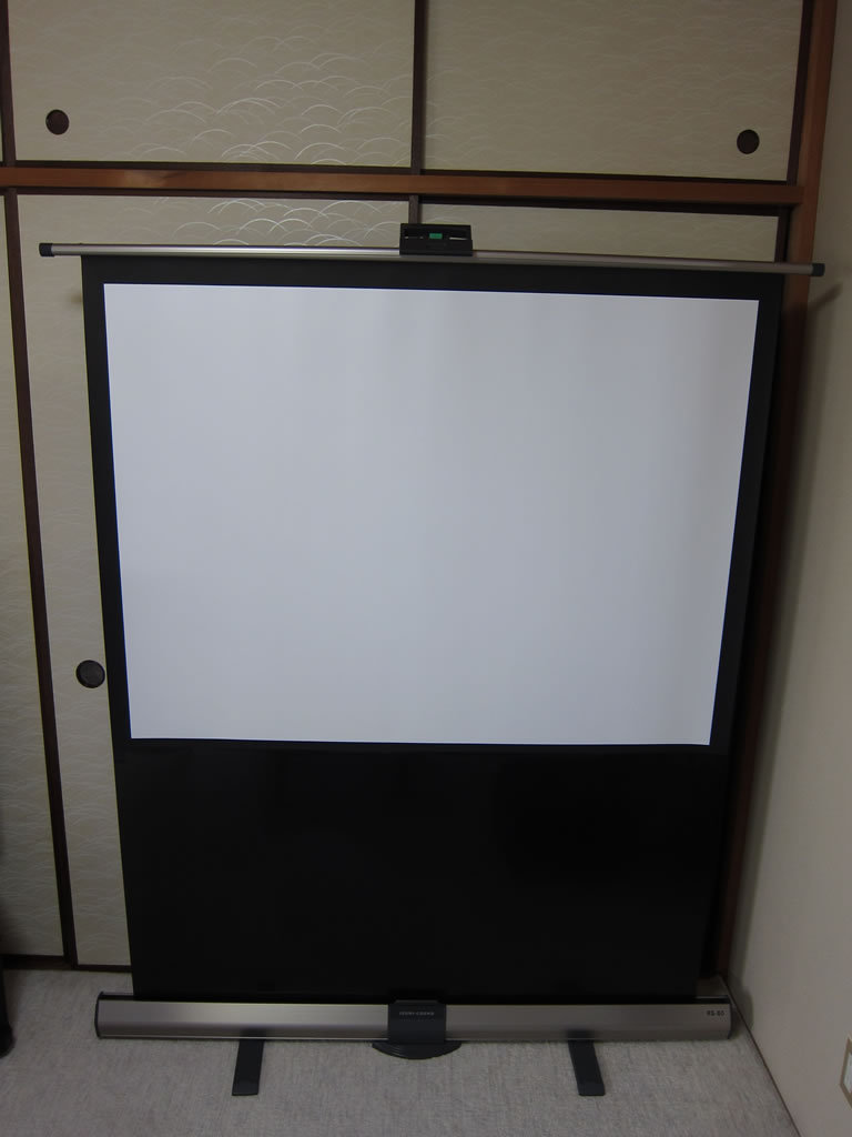 収納時はコンパクトにたため,いちいちフレームを組まなくてもワンタッチで引き出せるスクリーンを探していたところ,泉というメーカーの“RS-60”というタイプが一番使いやすそうだったので注文してみました。60インチなので,没入感という意味ではやや物足りないものの,ストッパーを外して引き出すだけで利用可能になるのはスコブル便利(パンタグラフのようなフレームで背面から支えている)。またフリーストップ式なので,高さ調整が自在なのも◎。