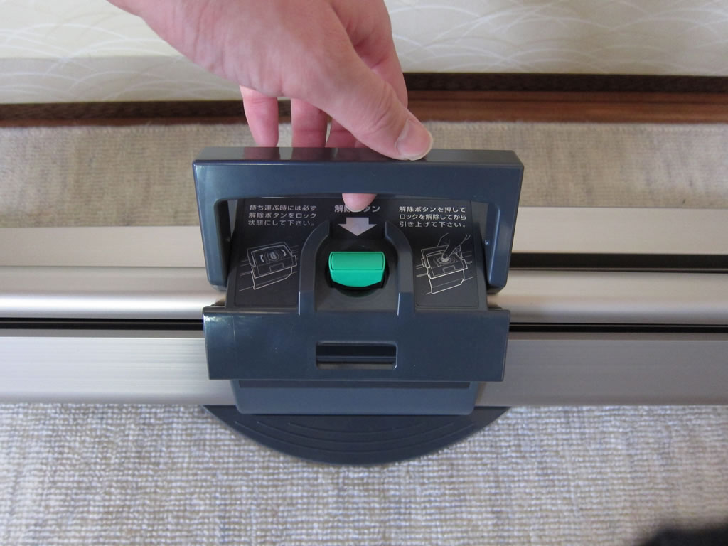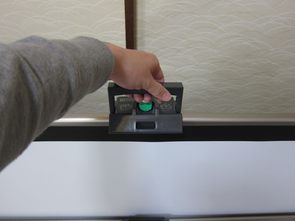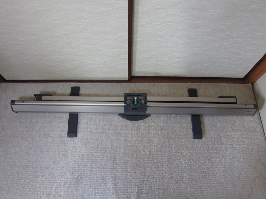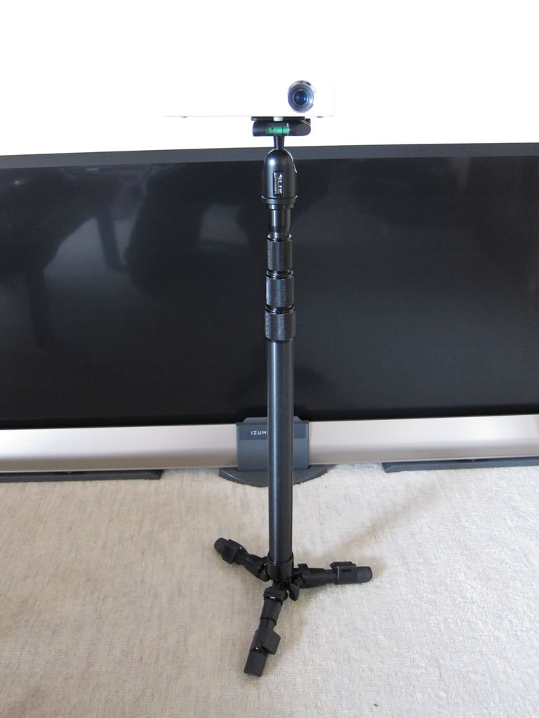 収納時はコンパクトにたため,いちいちフレームを組まなくてもワンタッチで引き出せるスクリーンを探していたところ,泉というメーカーの“RS-60”というタイプが一番使いやすそうだったので注文してみました。60インチなので,没入感という意味ではやや物足りないものの,ストッパーを外して引き出すだけで利用可能になるのはスコブル便利(パンタグラフのようなフレームで背面から支えている)。またフリーストップ式なので,高さ調整が自在なのも◎。