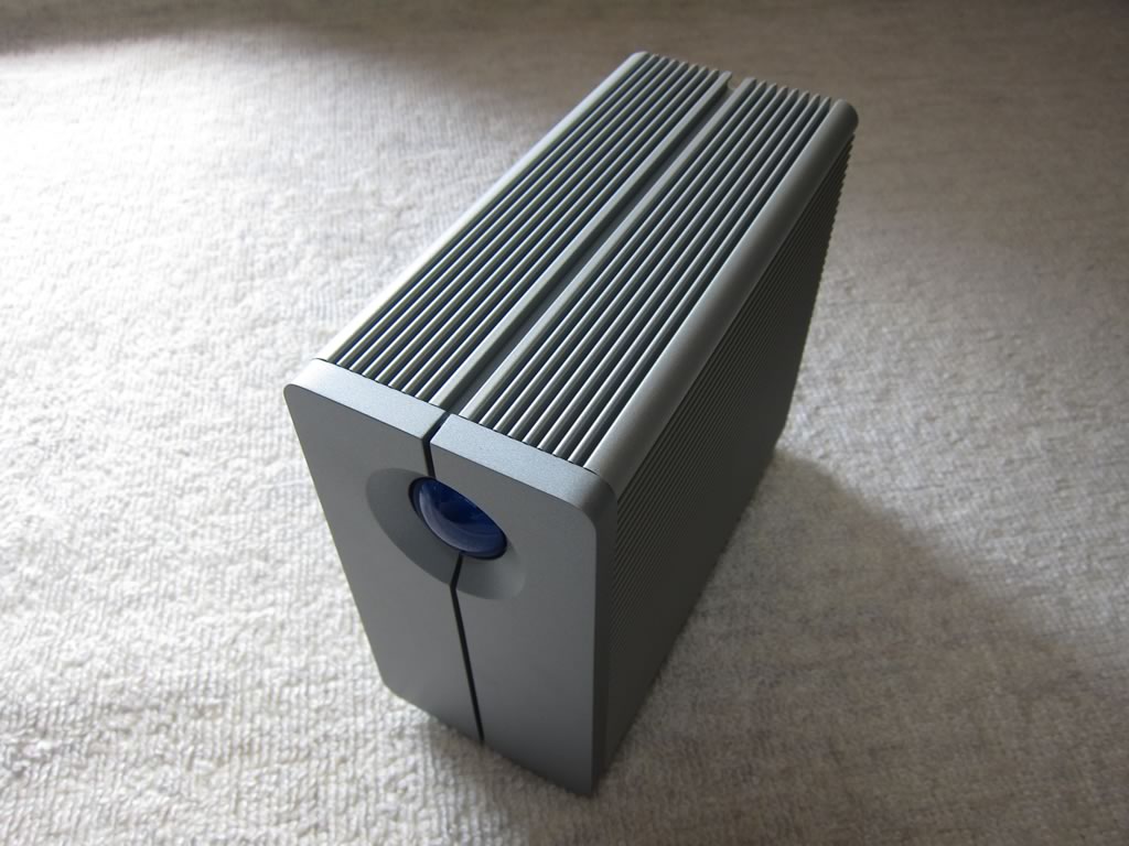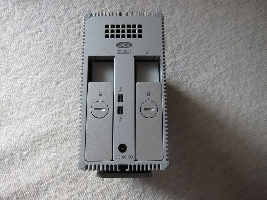 ついでにバックアップディスクとして別途調達したLaCieブランドのThunderbolt対応外付HDDの写真も。Mac miniはThunderboltポートが一つしか無いので,デイジーチェーンで繋げるのは助かります。Mac miniよりも遥かに重いので,うっかり足や床に落とさぬよう要注意(見かけによらずあまり安定性がよくないし)。個人的には電源内蔵にしてほしかったなぁ,とも。