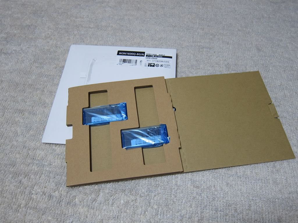 標準メモリからAmazonで別買いしたCFD製メモリ(DDR3 SO-DIMM PC3-12800 8GBx2)に換装。最近流行のフラストレーションフリーパッケージというだけあって,最小限のパッケージングですな。
