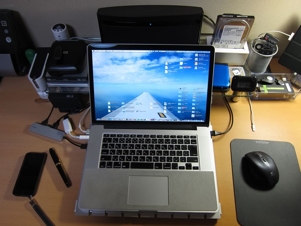 MacBook Proの後ろに設置してみた例。AirPlayなので,ホントはパソコンとは離れた場所に置いた方がいいのでしょーが,何せ場所がナイもので。