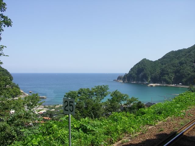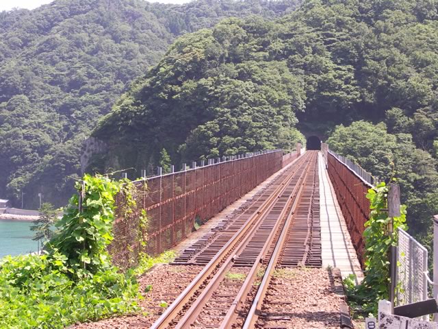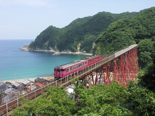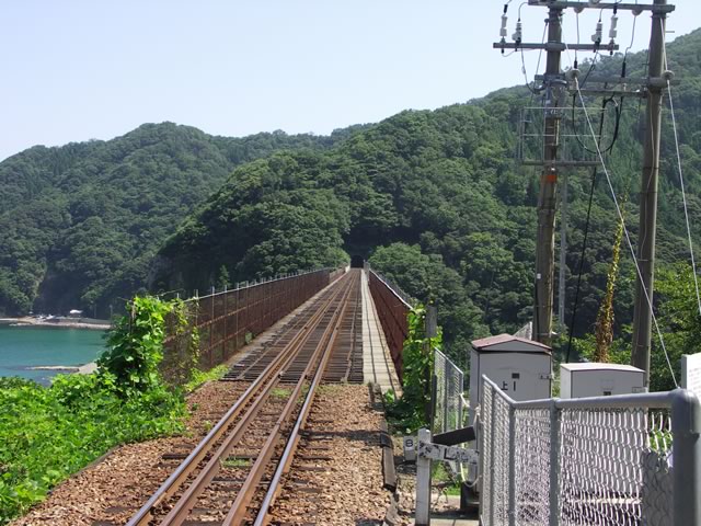 そしていよいよ餘部鉄橋へ。山並の中に突如現れる日本海が旅情をかき立てます。列車もここではスピードを落として走ってくれますね。