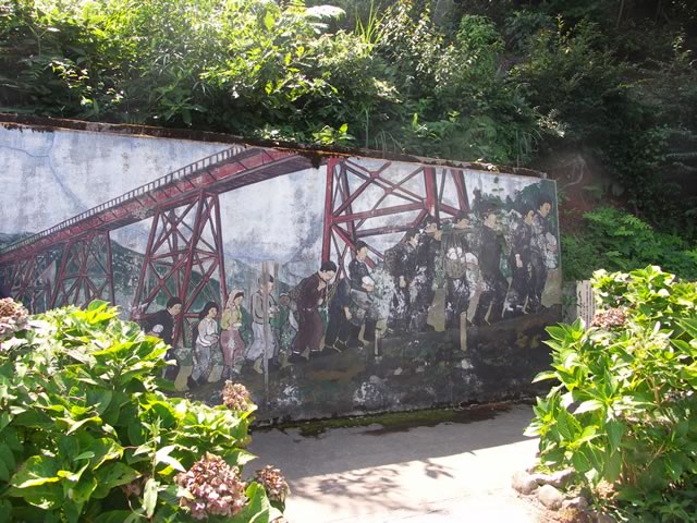 ホームから鉄橋を眺める。壁画の絵は,戦後餘部駅を作ることになった際に建設に協力した住民達がモチーフみたい。