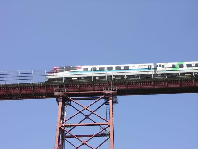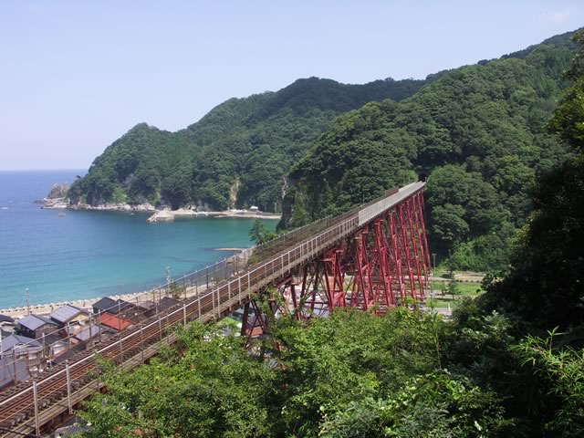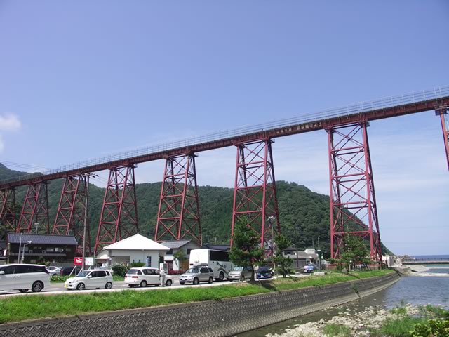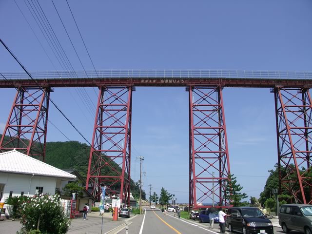 2007年春から掛け替え工事が始まる予定の餘部鉄橋(橋梁)に青春18きっぷを使って行ってきました。餘部鉄橋はJR山陰本線の鎧駅〜餘部駅間にある鉄橋で,明治時代に建設されたにもかかわらず,90年以上経った現在でも国内最大のトレッスル橋です。山陰の蒼い海に赤い橋梁が映え,観光客や鉄ちゃんの間でも人気のある橋だったのですが,強風のため冬場は渡れなくなることが多く,また海のそばで防錆処理が大変ということもあって,コンクリート橋に掛け替えることが決まってしまったのですね。そんなわけで,今のうちに餘部鉄橋の姿を目に焼きつけておかなくては,ということで,8月最後の週末,ちょっと遠出をしてきた次第です〜。