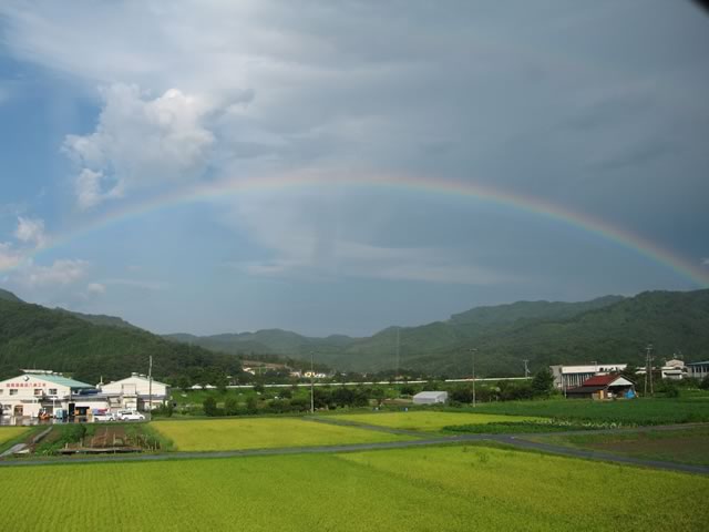 帰路の車内での一枚。和田山方面の列車に乗っていたとき,途中で待ち合わ停車があったのだけど,そのとき窓外に綺麗な虹がかかっていたので,思わずカメラを握ってしまいました。