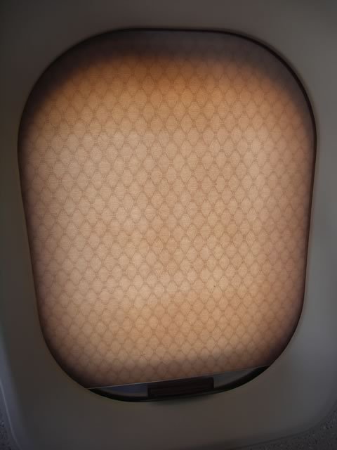 窓のフレームも撮ってみる。試しにブラインドを下ろしてみたり。非常口席のあたりの窓はたしかカーテンなんだよね。