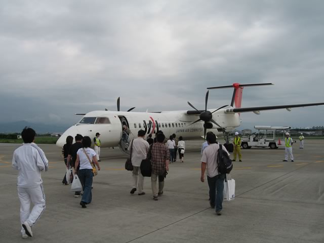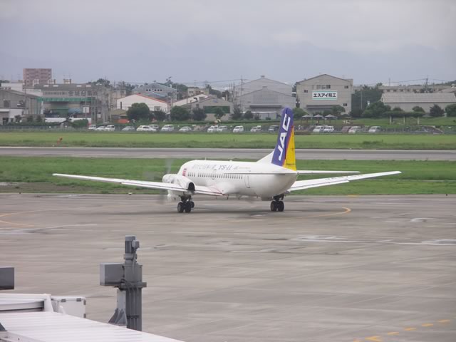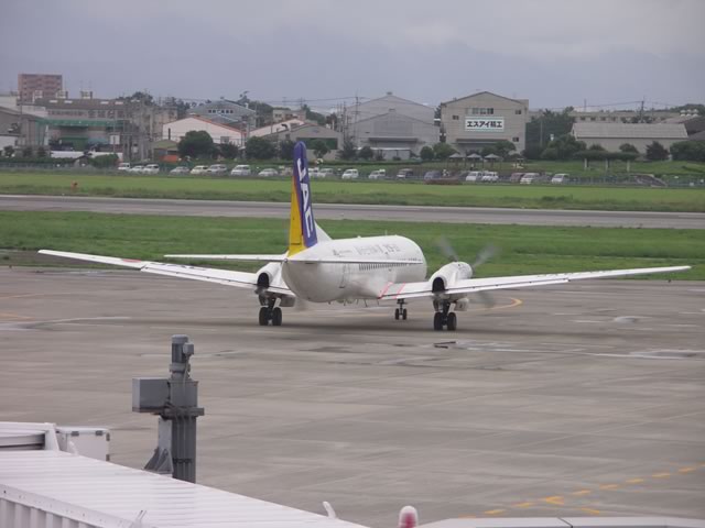 松山からは,伊丹行きのQ400に搭乗しました。ダッシュ8自体乗るのが初めてだったので,最新鋭の機体に期待(^ ^;)していたのだけど…うーん,イマイチ。ってのも,座席が劇薄でクッションがあまりないものだから,中のフレームが背骨に当たってイタいのですよ。また,気動車みたいな“出っ張り”が窓側の足下にあってみょーに乗りづらいし…。あと,QuietのQ400という割には機内はうるさかったね。YSの後方座席の方がまだ乗り心地いいような気も(身びいき?!)。