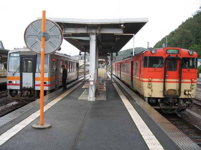 佐用駅で今度は津山行に乗り換えます。ここから先は,ちっこいキハ120。ちなみに隣のホームに止まっているのは,智頭急行の普通列車。