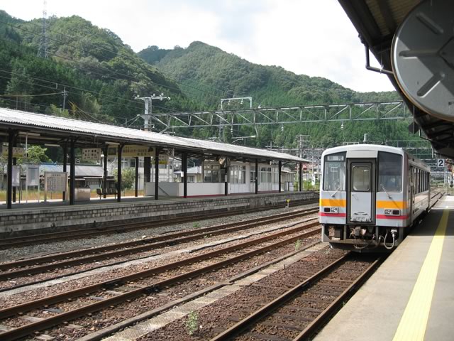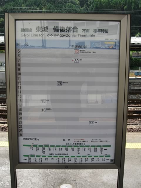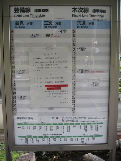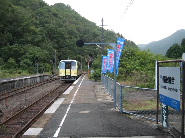 芸備線と木次線の合流点となる備後落合駅へ到着。ウワサには聞いていたけど,秘境駅ですなぁ(^ ^;)。なお芸備線は,7月の豪雨で土砂崩れが発生し,現在,備後落合−備後西城間はバス代行になっています。