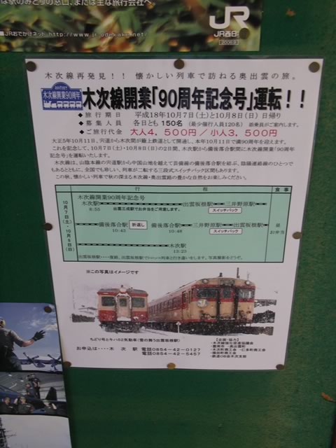 夏から秋にかけては観光列車奥出雲おろち号も走り,それなりに活気を帯びる木次線ですが,冬は大雪の影響で長期運休になってしまうことも多く,なかなか苦しい状況のローカル線であることには変わりないようです。もっとも1日3本のダイヤだと,使おうにも使えないし…。道路も整備されてしまったため,地元が出資して路線の高速化をはかるなど,抜本的な改良がないと今後生き残りはキビシイのではないかなと思います(備後落合−出雲横田間は特にね)。