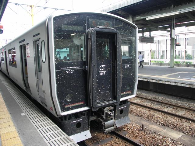 佐賀−鳥栖間は,Commuter Trainこと817系に乗車。JRQの新車はカッコいいデザインが多いのだけど…この車両,ちょっと汚れすぎてませんかー。黄色い点々は,すべて蛾の亡骸のご様子...。