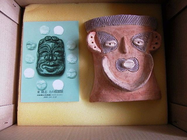 実はこのマスクは,東隆志氏という岡山県在住のアーチストの作品で,“縄文・弥生時代の祭祀に用いられた土偶・土面を主に,中世時代の民家に祀られた像・土面を模作し,染め付けることによって独自性を表現した”ものらしいですが,この個展の最中に偶然通りかがった私は,つい2点購入してしまいました。表情が面白いからという理由もあるのですが,まったく商売っ気がない様子に好感を持ったということもあります。でも,なかなかこの手は世間に認めてもらうのが大変でしょうね。私みたいな物好きならまだしも,実際はあまり売れてなかったようだし…そうそう,もしこの作品が気に入った人がいたらあげますよ。私の部屋にはすでに1点飾っていますから(おみやげ用に買ってきたのになぁ…^ ^;)。