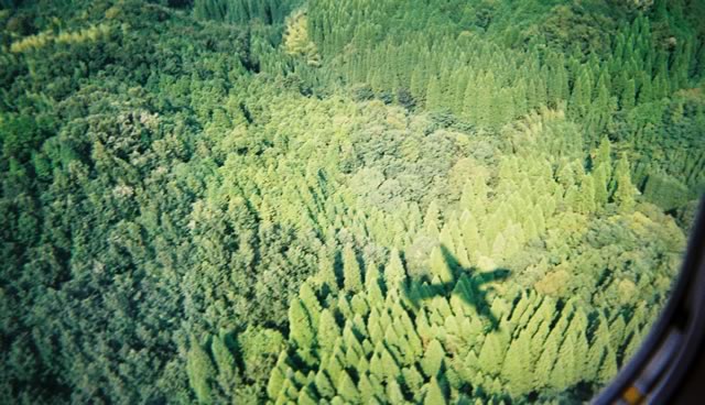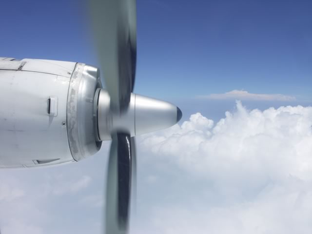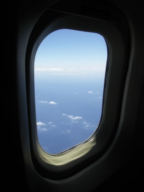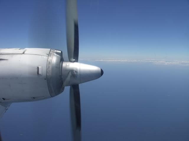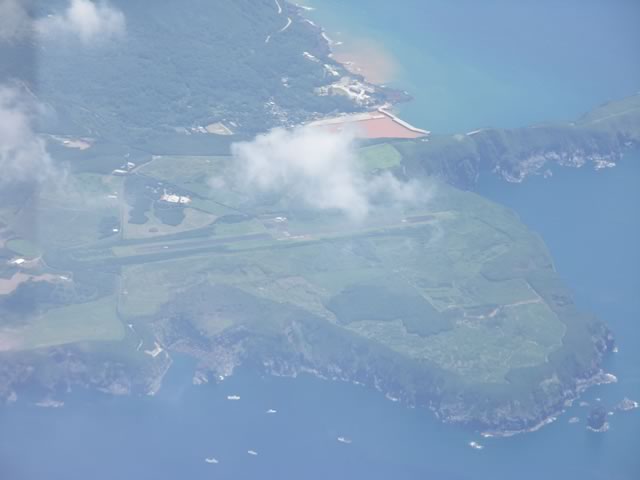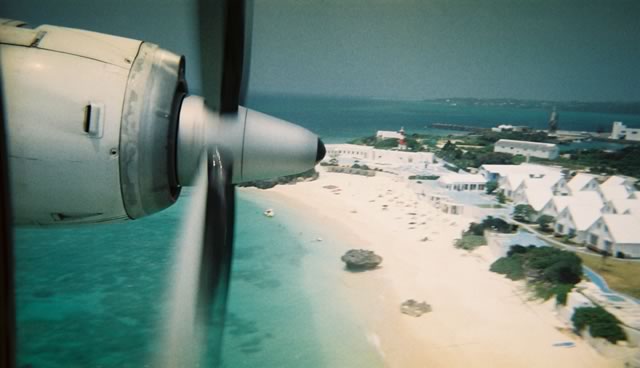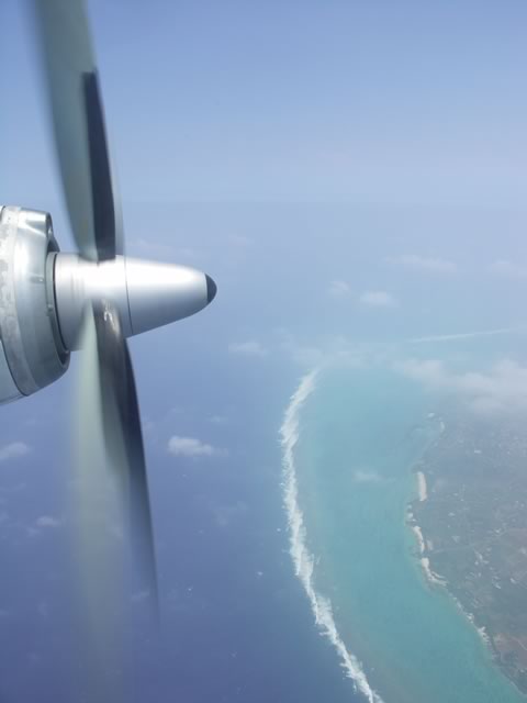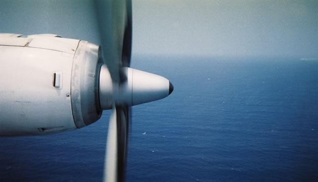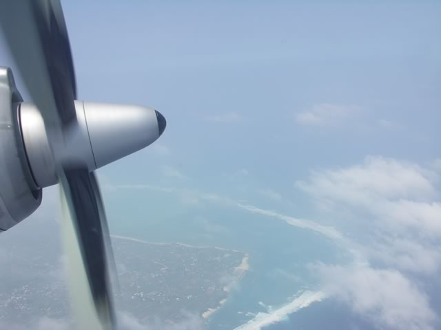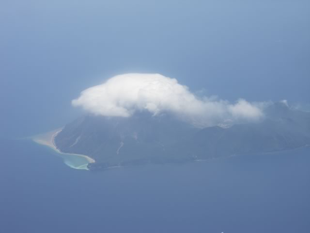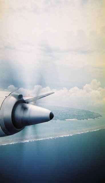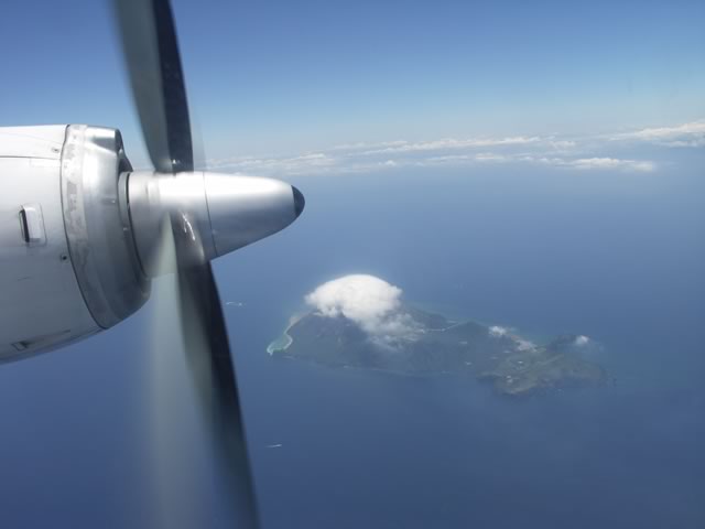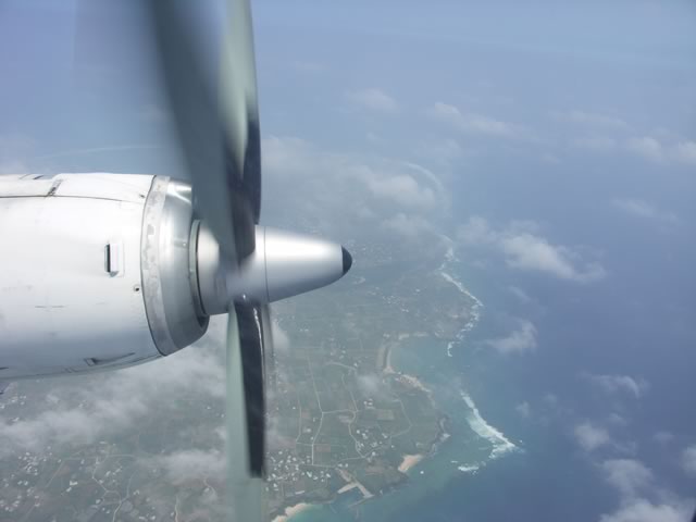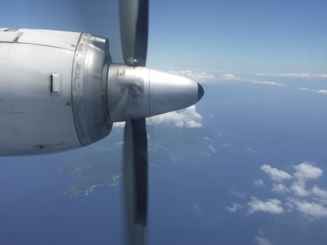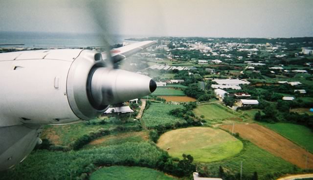 約2時間のフライトの後,与論島上空へ。これから機は大きく旋回し,タッチダウン。