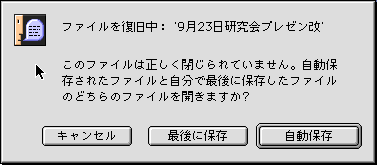 おいおいAppleWorks【リンク】〜。コイツを使って,来る22日のプレゼンの準備をしていたのですが,あるときアプリが突然強制終了してしまい,立ち上げ直すと「ファイルが正しく閉じられていません」みたいなメッセージとともに,“最後に保存”したファイルと“自動保存”したファイルのどちらを開くかというダイアログが出てきました。