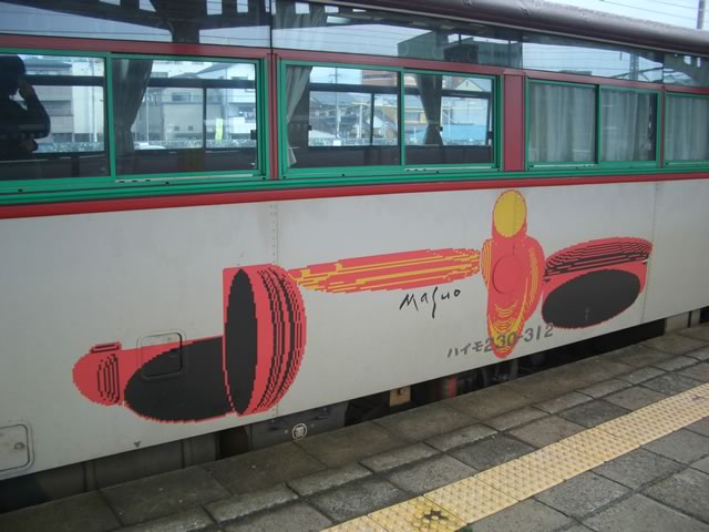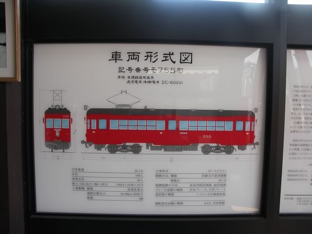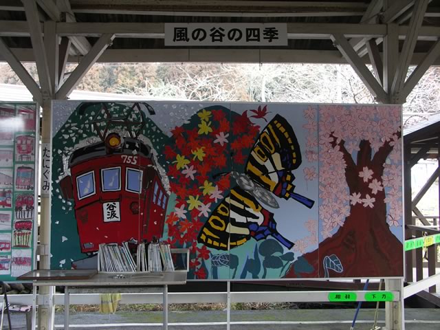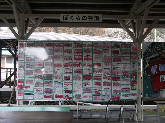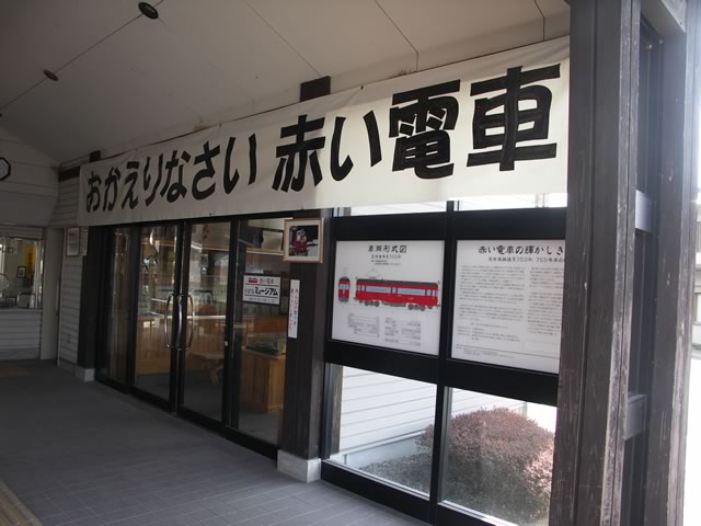 駅舎には,“赤い電車”ことモ755号が鎮座中。まだx2新しい駅舎に,今にも動きだしそうな列車の図…ここは,ホントに廃線跡なのでしょうか(^ ^;)。