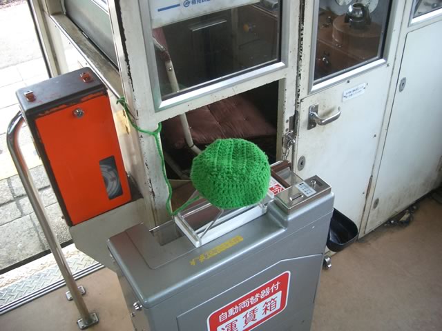 進行方向とは反対側の運賃箱には,かわいらしい毛糸のカバーが。