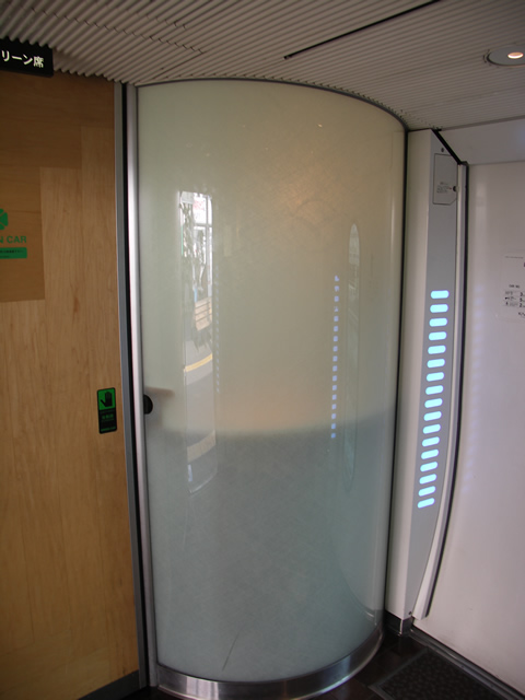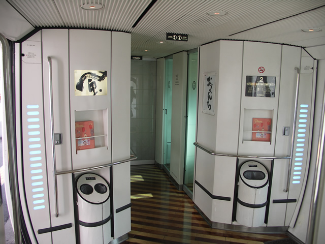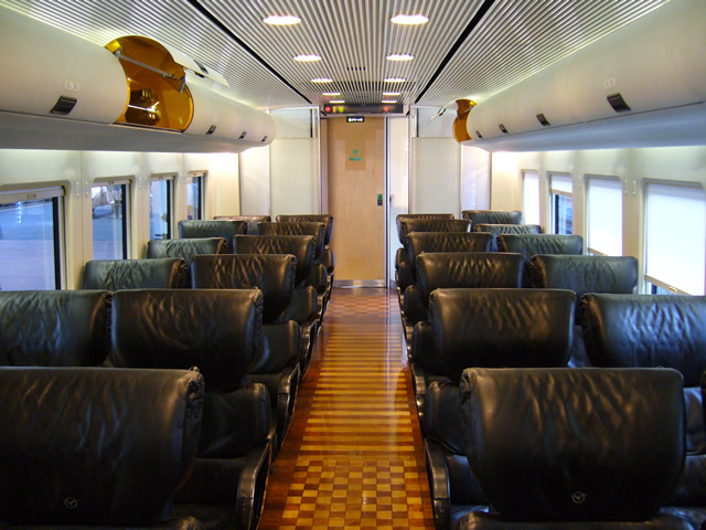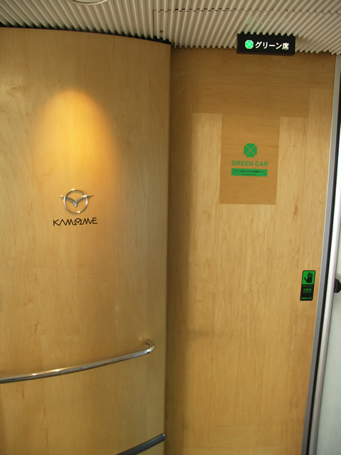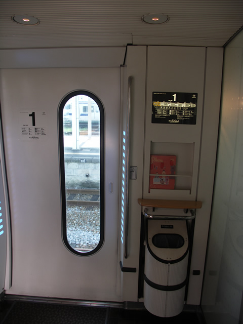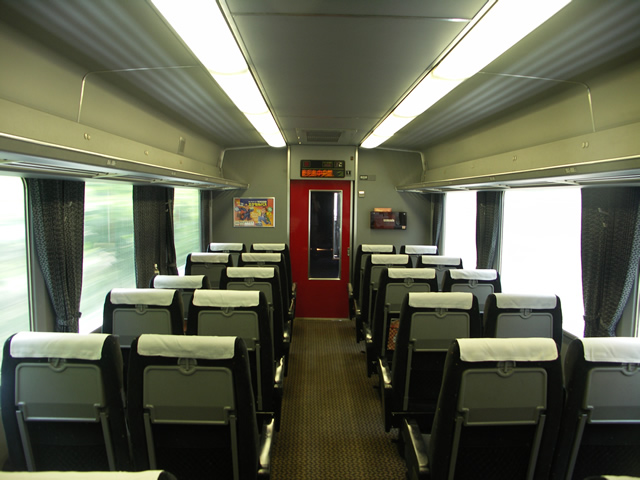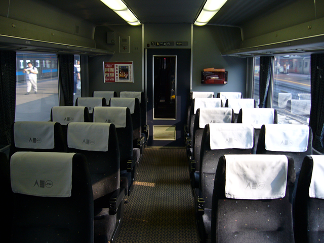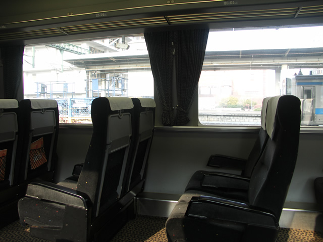 885系かもめの車内。普通席でも総革張りのシートに,オーバーヘッドストウェッジ…これで窓が小さかったらほとんどひこーきかも。おまけに無駄に豪華なロビーまであるしー。
