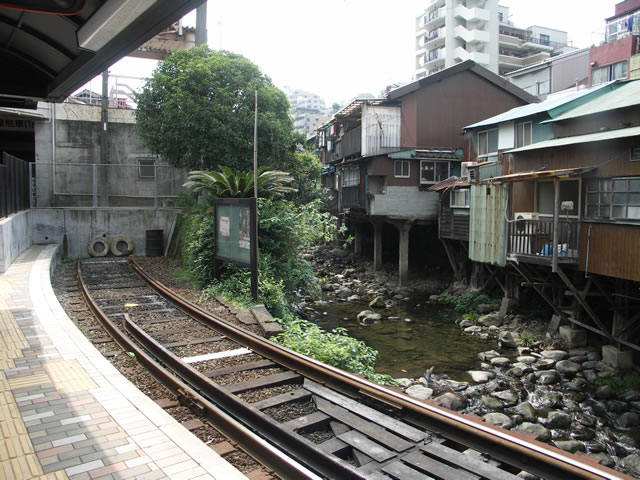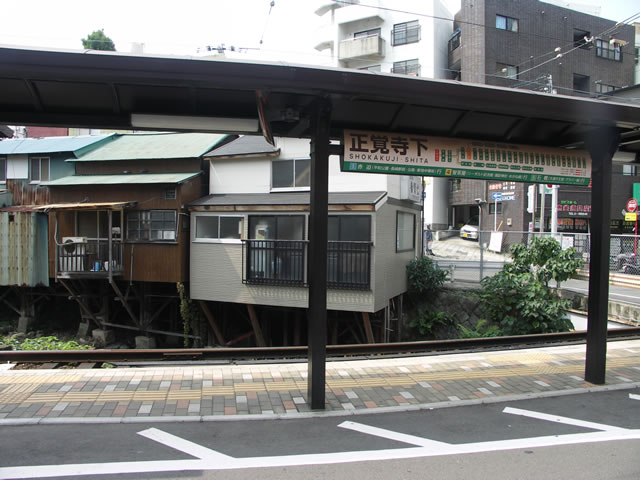 正覚寺下電停の様子。末端が単線のため,ともかく入換が多い。