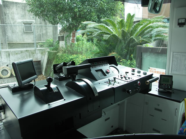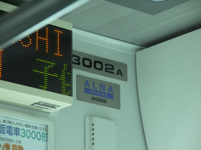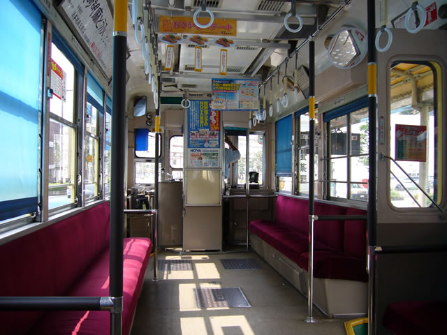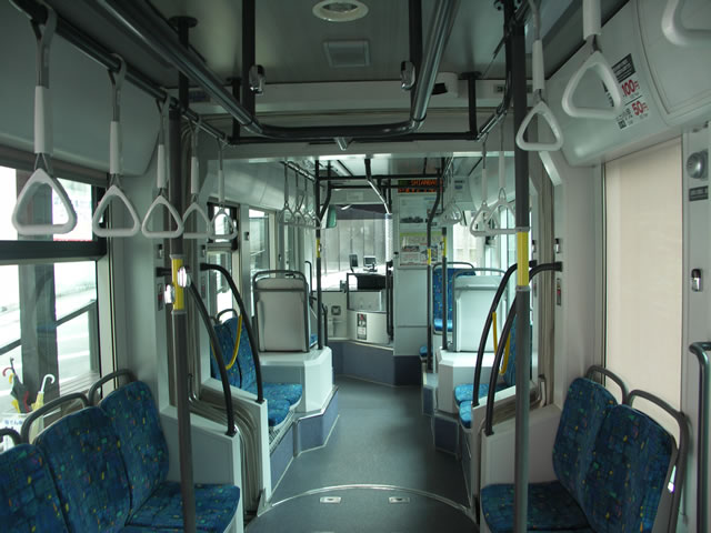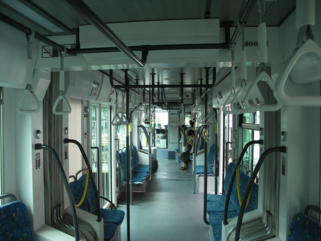 リトルダンサー タイプUこと100%低床路面電車3000系の車内。長崎電軌は比較的軌道状態が良好なことも関係しているかもしれませんが,乗り心地がよく,加速性能もなかなかです(それに座席のクッションが厚くていいね)。トラムのファンとしても,ようやく国産でここまで作れるようになったことを嬉しく思います。