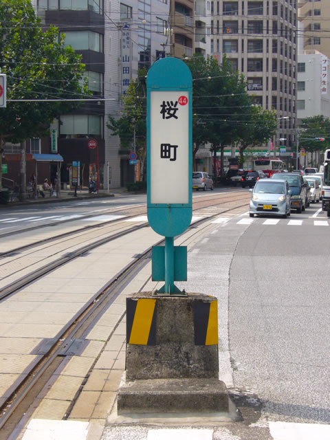 桜町電停。マイ小説の舞台と同じ名前ということもあり,思わず途中下車>さくらまち。ほんとに同じ名前の電停があるとは思わなかったな〜。