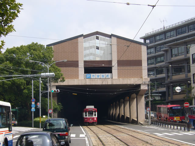 こちらも市内線末端の蛍茶屋電停。坂の途中にありました。電車がビルの中に吸い込まれているのが特徴的かな。