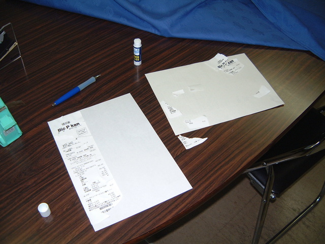 上の写真は,そのレシートを復元している様子です。こんな写真を撮る自分もアホやな〜と思いつつも,最近マメに“宇宙の底”を更新しているせいか,ネタ詰まりを起こしがちで,『よしゃ,今日のネタはもらった』と内心ニヤついていたかも…(汗)。ちなみに,気付いたのが早かったこともあってか,ピースを全部回収でき,復元は何とか完了しました〜。ただ,昨日は何しに大学に行ったんだろうね(苦笑)。