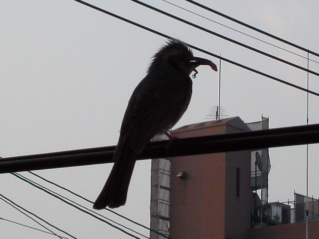 明け方,鳥の“さえずり”で目が覚めた。で,その鳴き声がなーんかいや〜んだったんですよ(^ ^;)。「ぴぃー↑(アップテンポ)ぴぃっーー↑」てな具合に,もぉブサイクやなー,とツッコミたくなるほど,かわいくない鳴き声のフォルテシモ。しかも大音量で繰り返し鳴きやがるので,二度寝しようにも寝られず,思わずデジカメで撮ってしまいました>トリ。トリミングしたので,やたらと大きく見えるかも知れませんが,フツーのカラスよりは小さかったです。誰か,コイツの正体を知りませんか〜(オマエ,元生物科だっただろー,とかいうツッコミはなしね^ ^;;)。