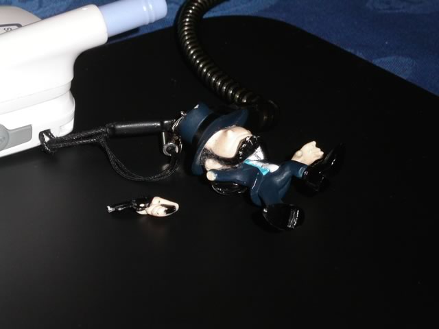 携帯のストラップについているマスコットなんだけど,ある日ポロっと手が取れてしまいました。見事な“切断具合”に思わず写真を撮ってしまった図(→アホ^ ^;)。