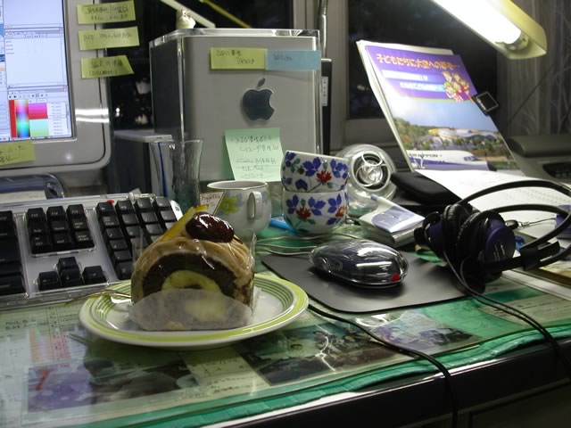 たまにどこからともなくケーキ等の差し入れを頂くんだけど,こうやって置いていると,とても仕事机に思えないところがびみょーに微笑ましかったかも(ちなみに奥の林檎マークは,拙作短編小説『ターニング・ポイント』にも出てきたPowerMac G4 Cubeね)。別に深い意味はありません。ただそれだけです〜(^ ^;;)。
