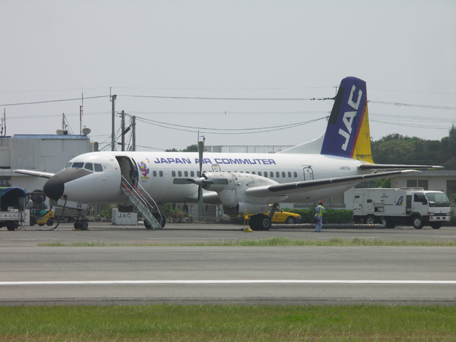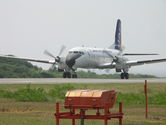 降りてすぐ,“手渡し”の手荷物受取所を出,撮影がてら屋上(2階)の展望デッキに向かうと…ガーン,閉鎖されている〜。「テロ防止のため」ってアンタ,どこの誰がこんな最果ての島でそんなことをするんだー,とツっこんでしまったかも。正直,無粋&ガッカリ。YSをギリギリの位置から眺められる格好の撮影ポイントだったのだけどなぁ>与論空港展望デッキ。