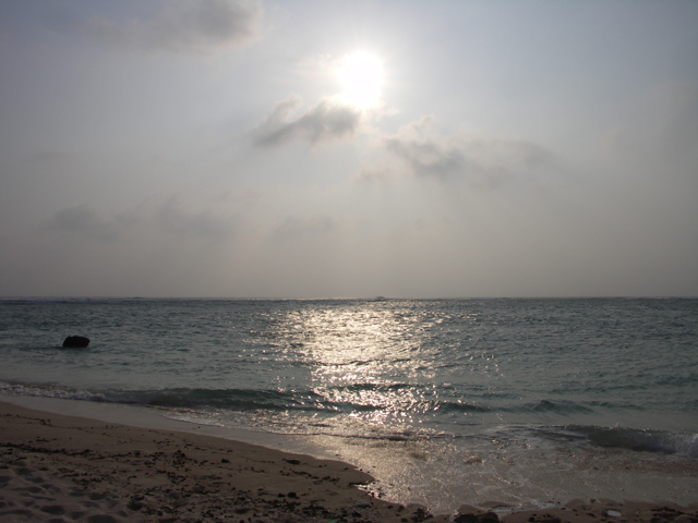 夕刻。某リゾートホテルのプライベートビーチ脇の海岸で軽く水遊び。