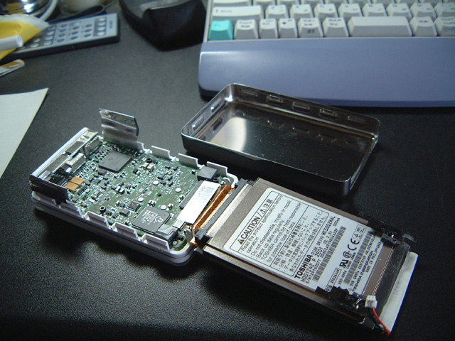 約1年酷使してきたiPod(5GB)がある日突然Macと接続できなくなってしまったため,原因を究明すべく分解してみました。下の写真はそのときの様子です。