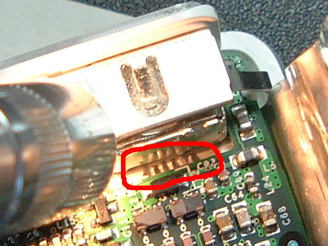 で,工学的な知識はないものの,どこが悪いのかしげしげ眺めていると,何となく不具合の元であろう場所を特定することができました。FireWireポートとメインボードを繋ぐ接点が断線してしまっているのですね(下図の赤丸の部分)。