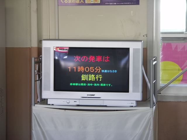 根室駅に戻り,釧路行きの列車を待つ。電光掲示板ではなく,テレビに案内を表示している模様。