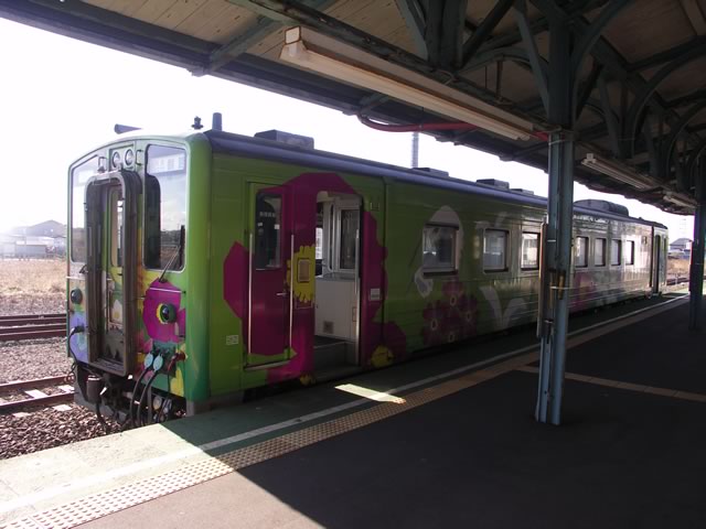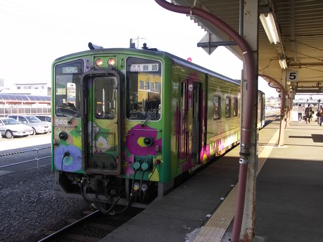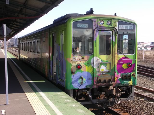 花咲線には特急列車は走っていないので,快速はなさきで移動。ズバリ花柄です。