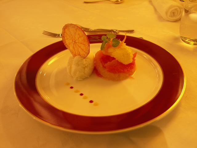 シトラスのムースと柑橘フルーツ ココナッツのソルベ,オレンジとグリオットのソース