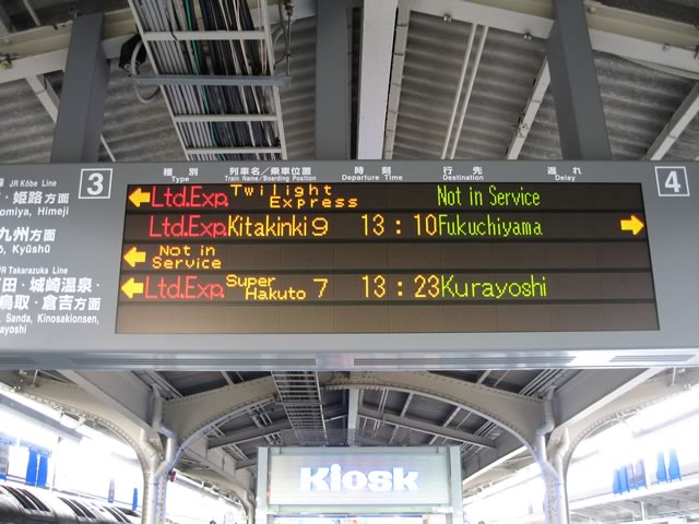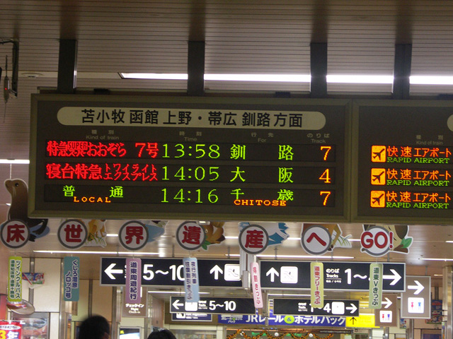 寝台特急トワイライトエクスプレス,14:05発大阪行き。釧路や千歳といった行先の中に“大阪”が混じっていると,まるで羽田空港にいるような気分になります。